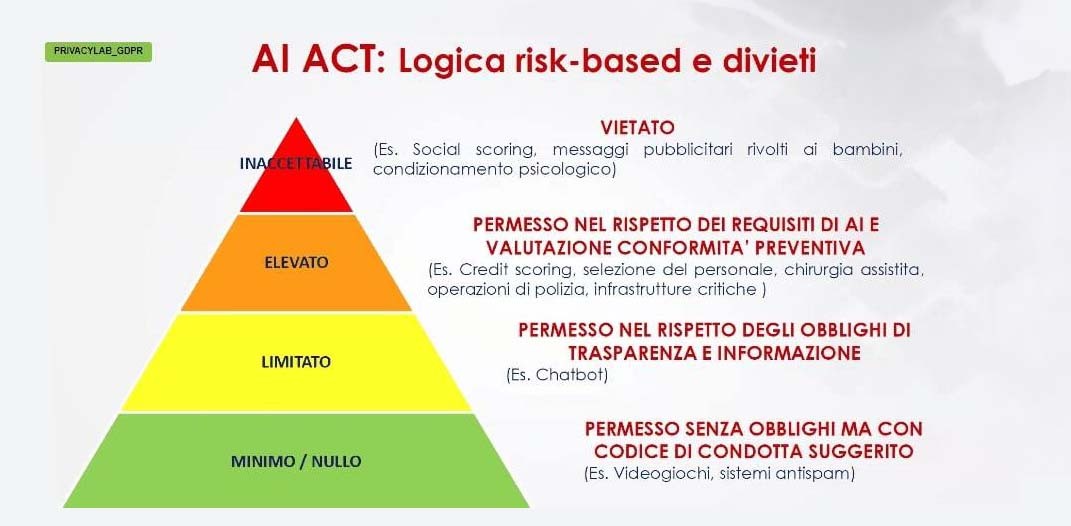 Immaginiamo una piramide, alla cui base troviamo le attività a rischio minimo o nullo. Salendo troviamo, invece, le attività a rischio limitato, più su le attività a rischio elevato e al vertice le attività che prevedono un rischio inaccettabile.